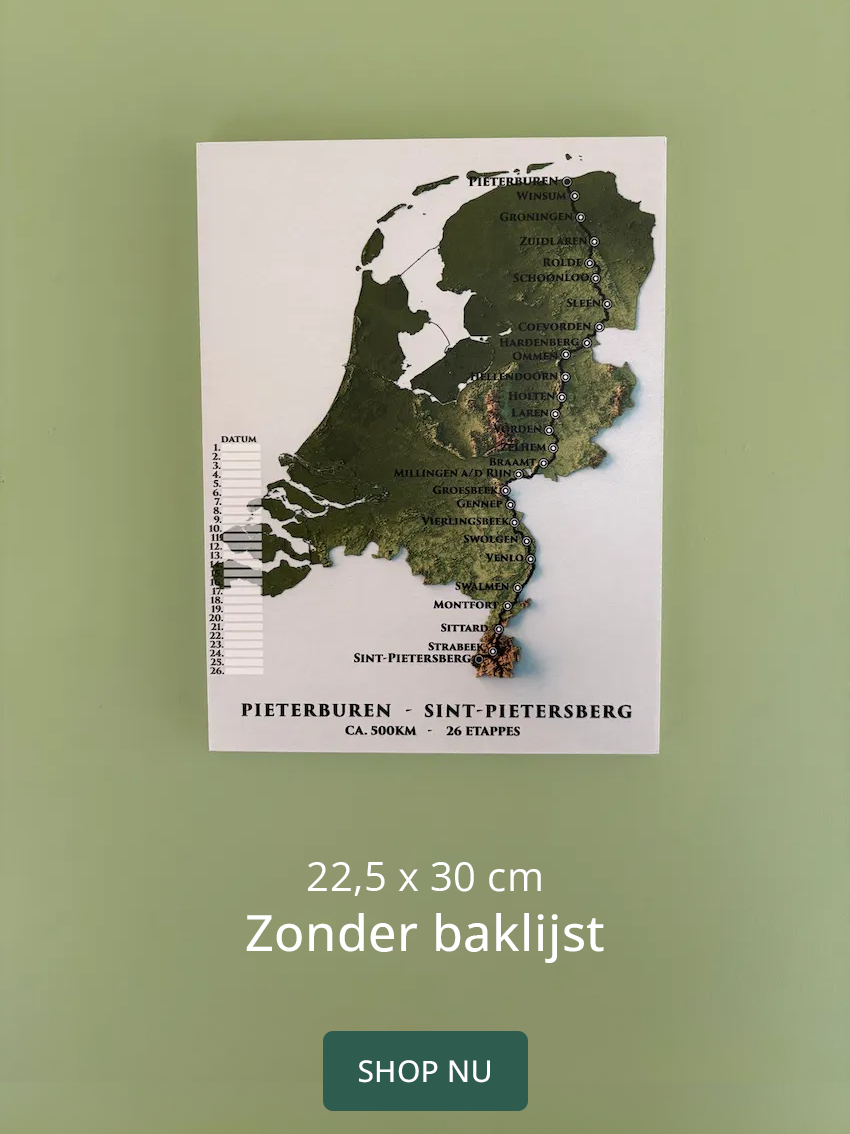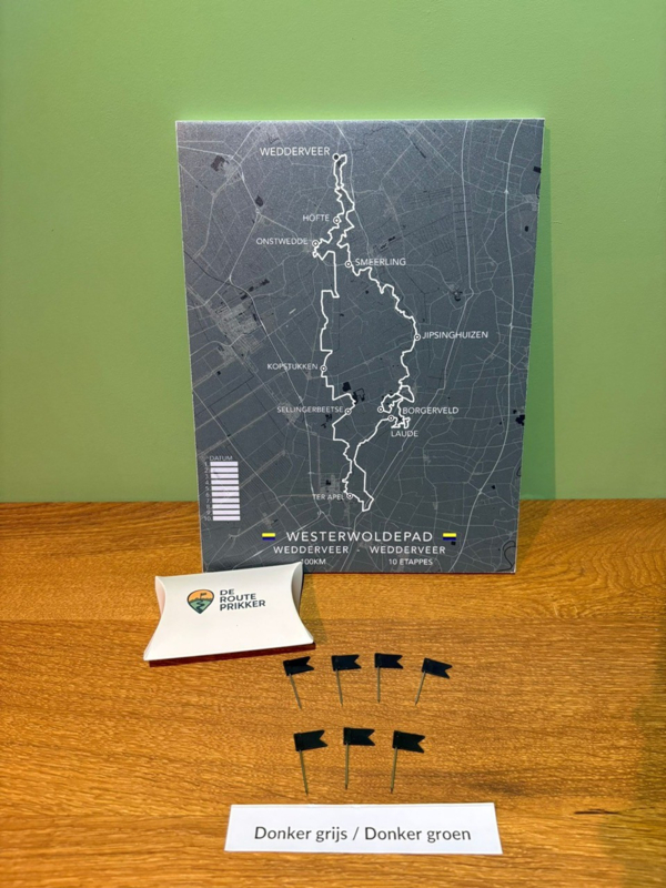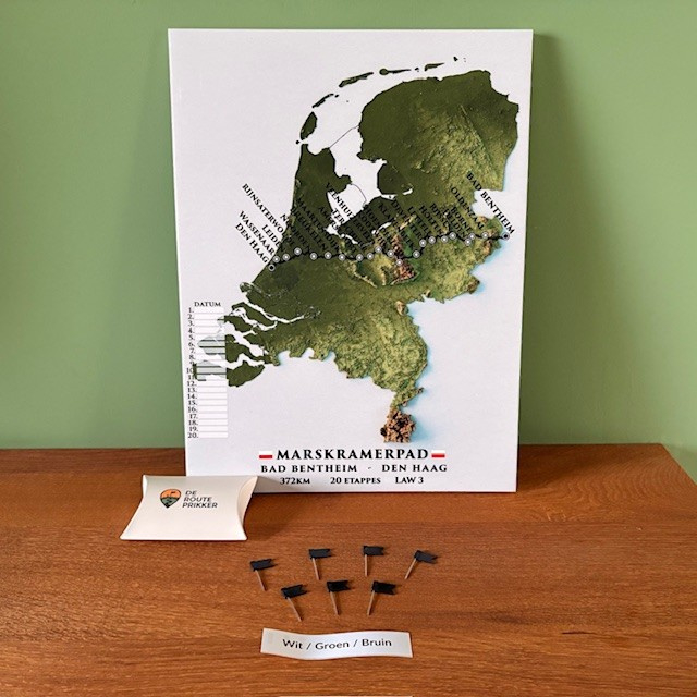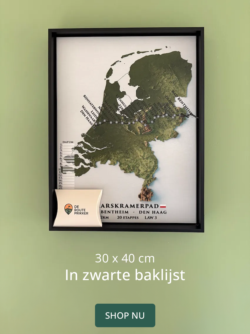 Bij De Routeprikker brengen we jouw wandelroute tot leven met stijlvolle kaarten op PVC-vrij schuim. Perfect dus als cadeau. Gebruik de bijgeleverde vlaggetjes om jouw etappes bij te houden. Zo wordt jouw route niet alleen een herinnering, maar ook een blikvanger aan de muur. Het product wordt geleverd in een prachtige houten baklijst met ophangsysteem.