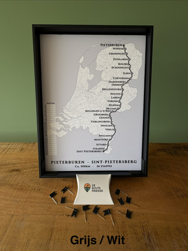 Maak van elke stap een blijvende herinnering. Dit stevige schuim-paneel toont jouw gekozen wandelroute, waarop je je voortgang eenvoudig bijhoudt met de meegeleverde vlaggetjes. Vul de datum in wanneer je de etappe gelopen hebt. Perfect voor fanatieke wandelaars die hun tocht willen visualiseren, of als uniek cadeau voor een avontuurlijke vriend(in).