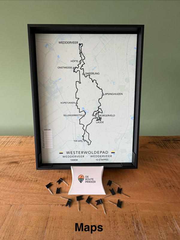 Maak van elke stap een blijvende herinnering. Dit stevige schuim-paneel toont jouw gekozen wandelroute, waarop je je voortgang eenvoudig bijhoudt met de meegeleverde vlaggetjes. Vul de datum in wanneer je de etappe gelopen hebt. Perfect voor fanatieke wandelaars die hun tocht willen visualiseren, of als uniek cadeau voor een avontuurlijke vriend(in).